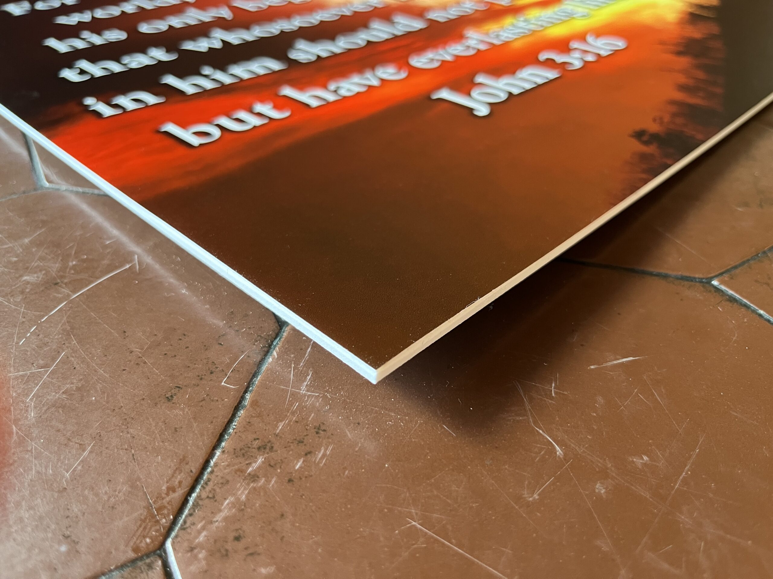 It is printed on a styrene board with a protective lamination coating the entire surface. Styrene is a 3mm plastic substrate that does not warp and can easily be framed or stored. The protective lamination boasts a satin-like finish that gives a print substantial protection from UV, scuffs, and scratches.