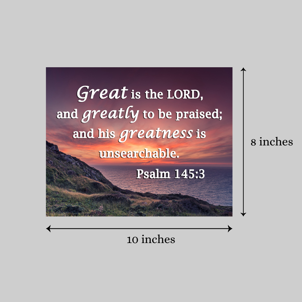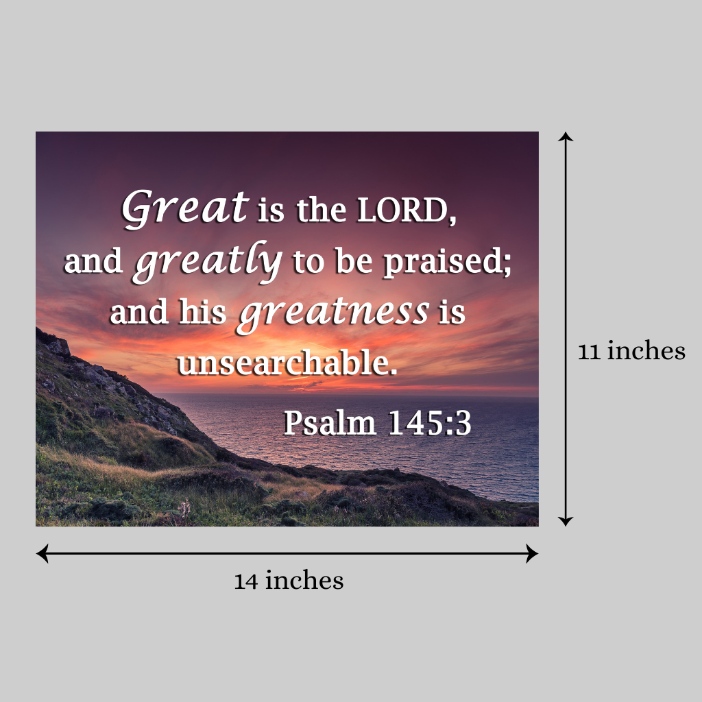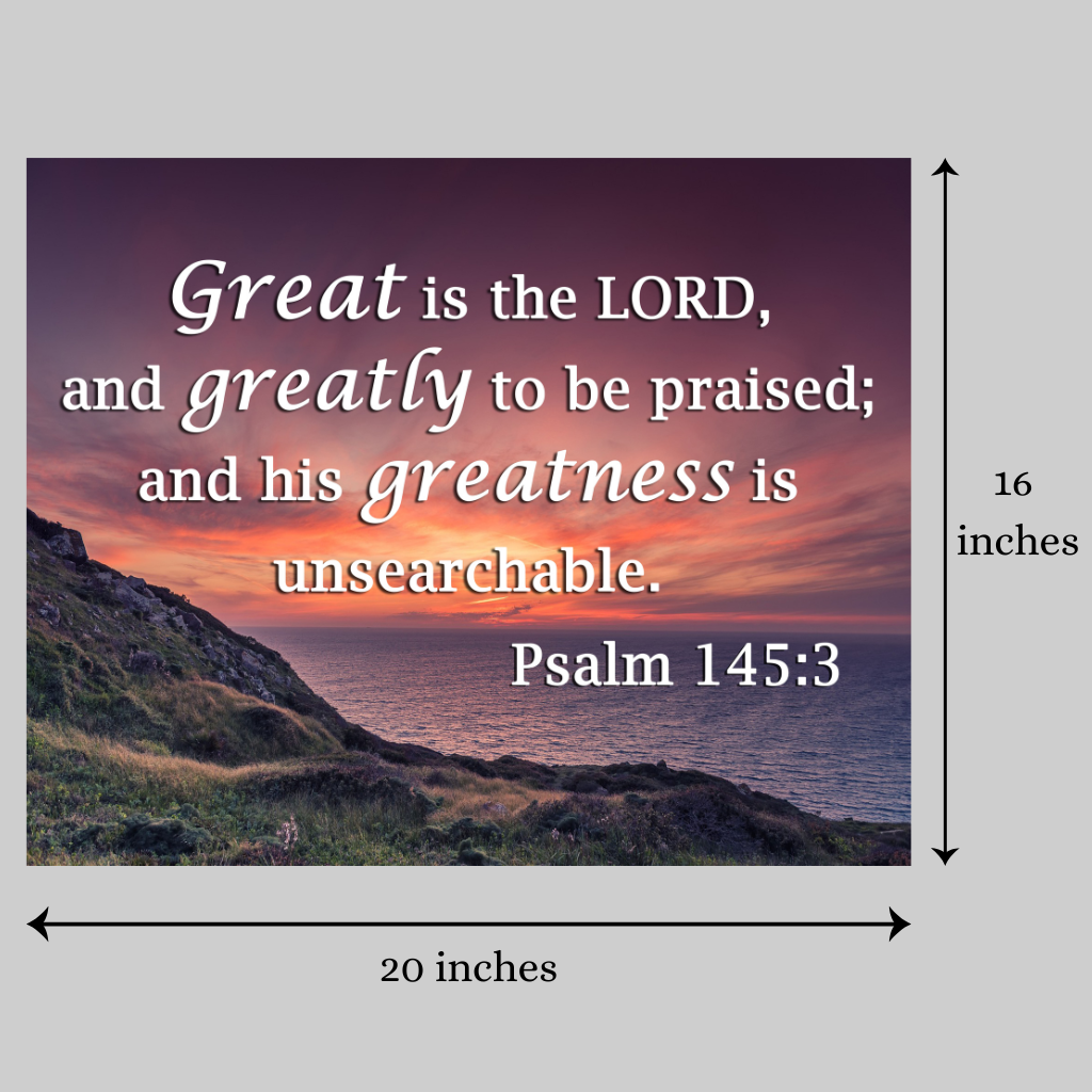 KJV Psalm 145:3 is printed on a styrene board with a protective lamination coating the entire surface. Styrene is a 3mm plastic substrate that does not warp and can easily be framed or stored. The protective lamination boasts a satin-like finish that gives a print substantial protection from UV, scuffs, and scratches.